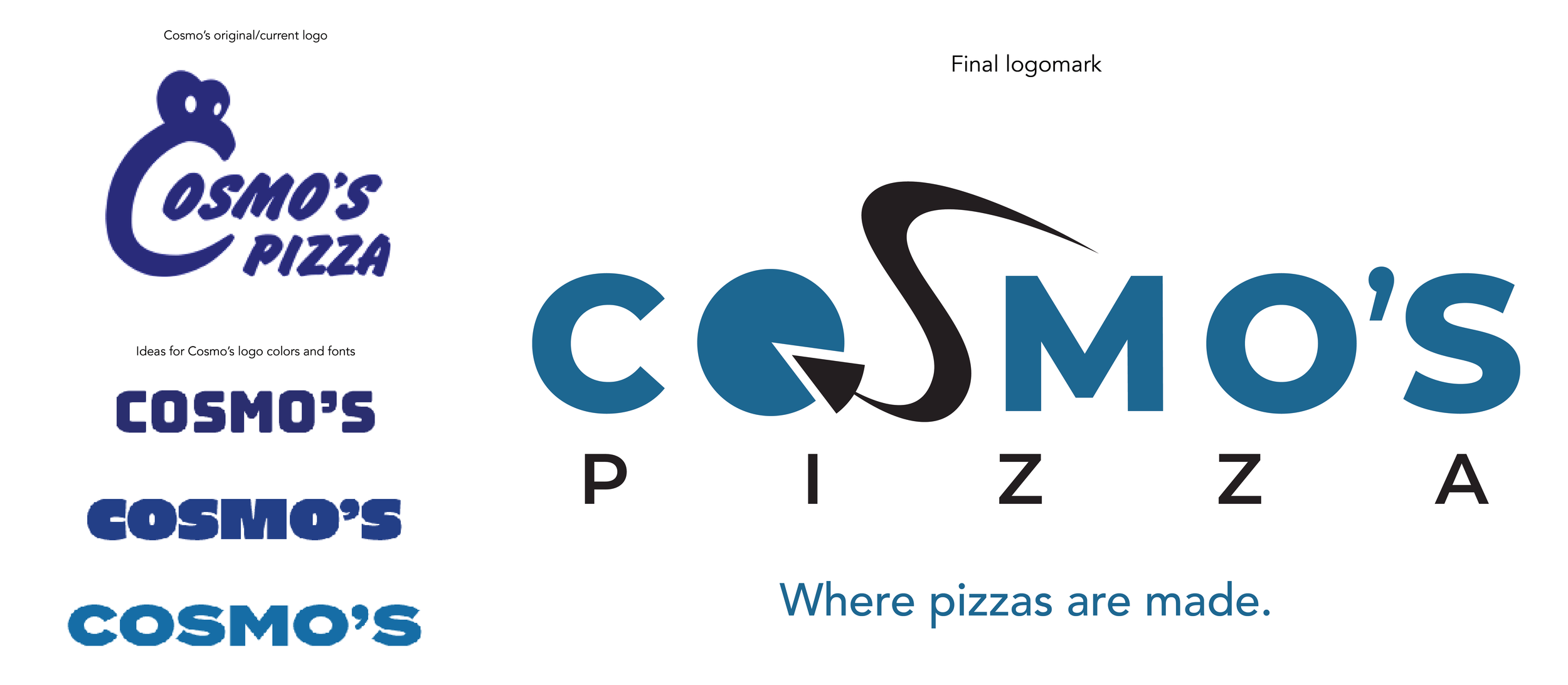 Cosmo’s is historically a late-night outlet for college kids with the munchies. Although Cosmo was the original owner, I wanted to give more meaning to the word. As one kid may ask another, “Where’d you get that pizza?” The other would reply, “Cosmo’s. It’s where pizzas are made!”