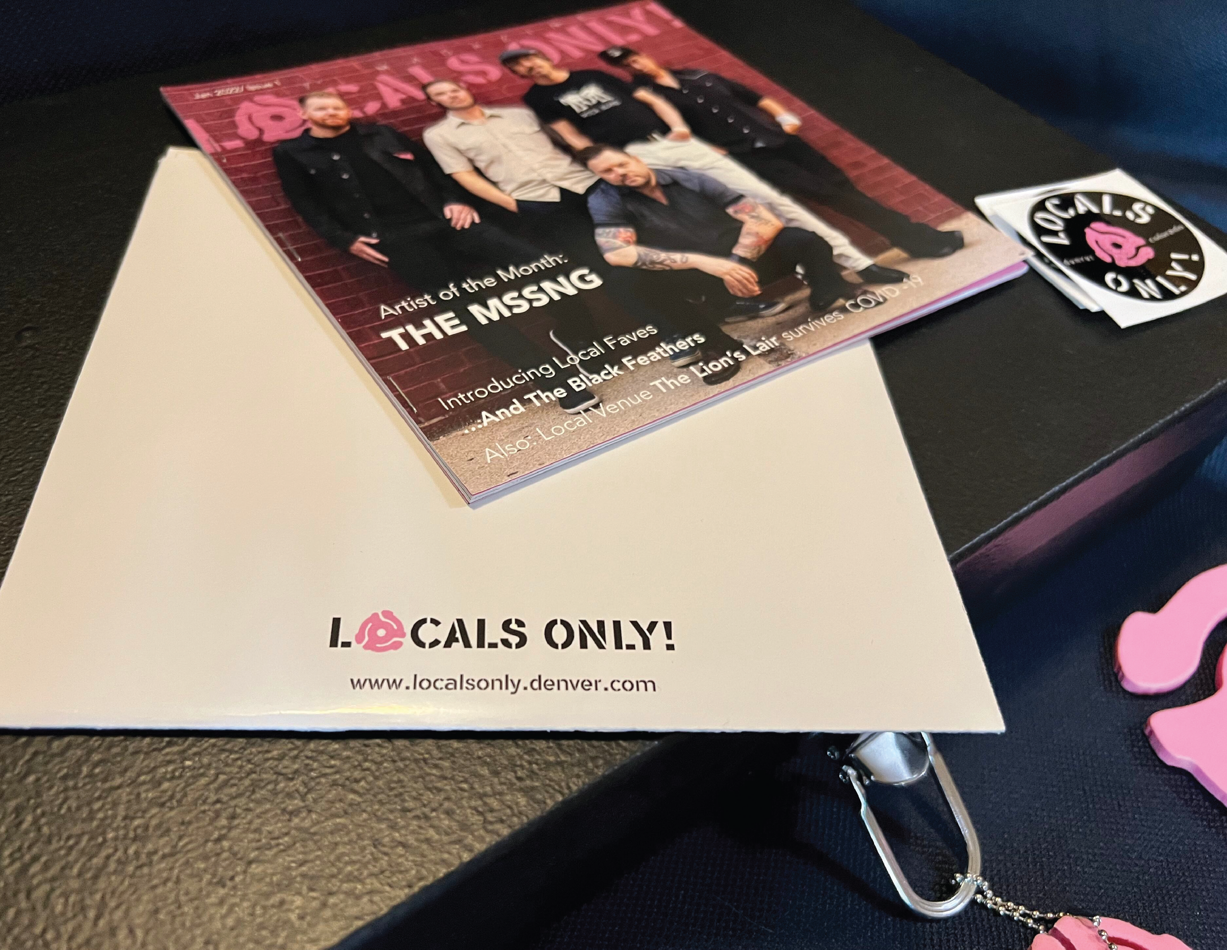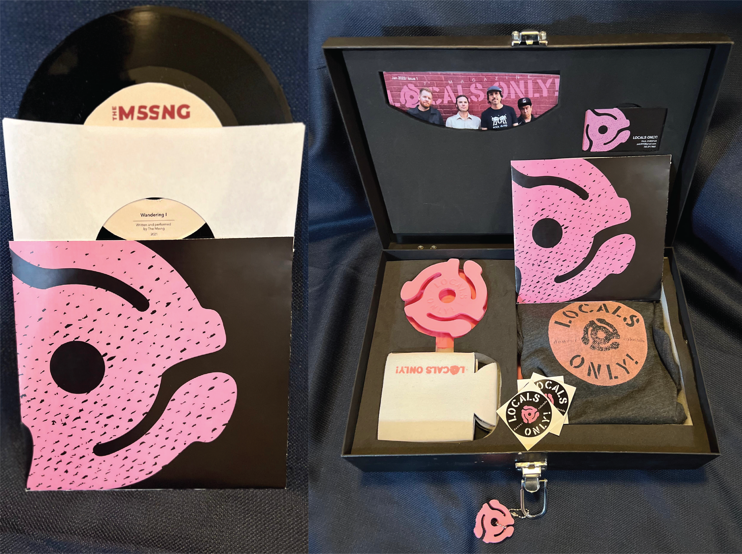 The box would contain the band of the month’s swag as well as some Local’s Only! swag and goodies. Swag could vary between t-shirts, records, CDs, tapes and event tickets. This box contained a Locals Only! zine, a 7” record, 2 coozies, 4 foam coasters, a t-shirt, a business card and Locals Only! stickers.